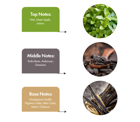 Notes: Mint Leaves, Green Apple, Tonka Bean, Geranium, Vanilla, Vetiver, Oakmoss