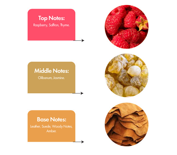 Notes: Raspberry, Saffron, Jasmine, Olibanum, Leather, Amber