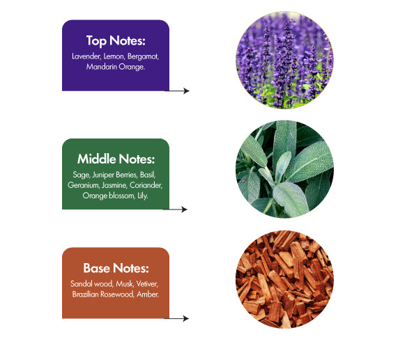 Notes: Lavender, Mandarin Orange, Basil, Geranium, Sage, Sandalwood, Rosewood, Amber