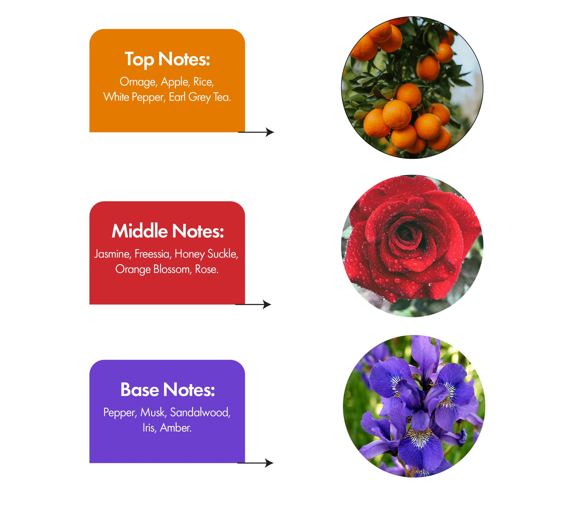 Notes: Passion Fruit, Grapefruit, Pineapple, Peony, Vanilla Orchid, Red Berries, Musk, Woody Notes